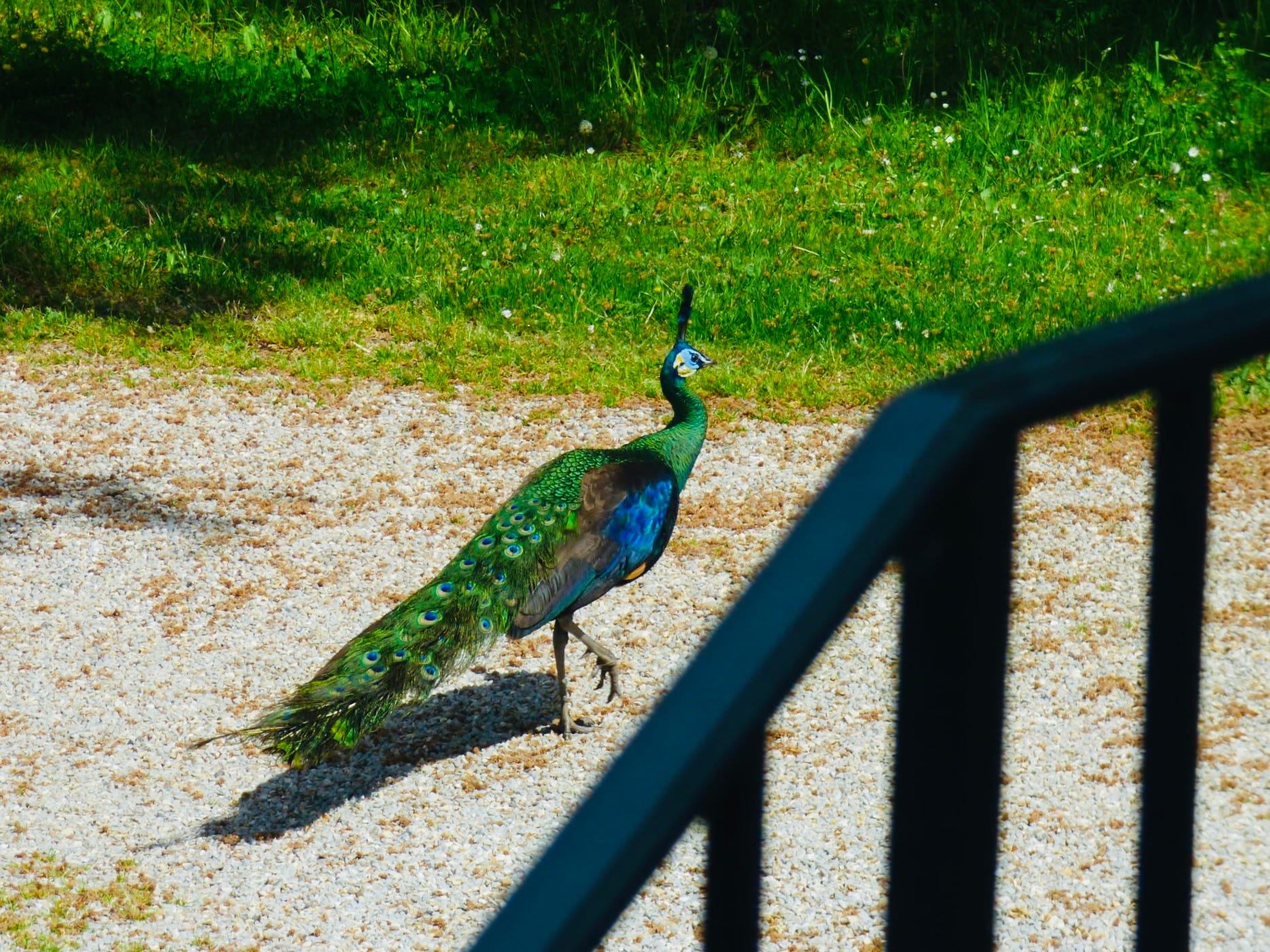 The roses are in their first full bloom. Clematis drapes over the stone walls of the bâtiments de la ferme. Trees we planted in the parc have filled out and have grown taller. The waterlilies in the moat survived the depredations of the late and unlamented ragondin. And a peacock, wrote Monsieur Martyn, paid us an impromptu visit.