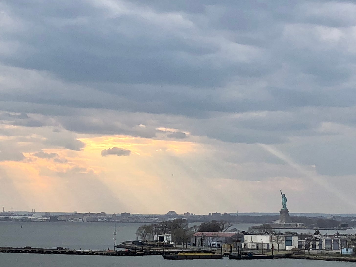We went outside to gather on the aft deck with a crowd of fellow passengers. A few hardy travelers frolicked in the pool. A halo of glowing afternoon light traced the skyline of New York. Windows of skyscrapers blazed in the sharp beams of a fading sun. The ship pulled away into the harbor.